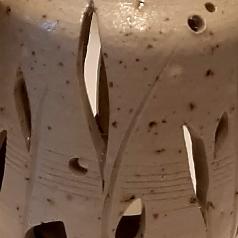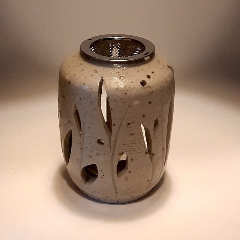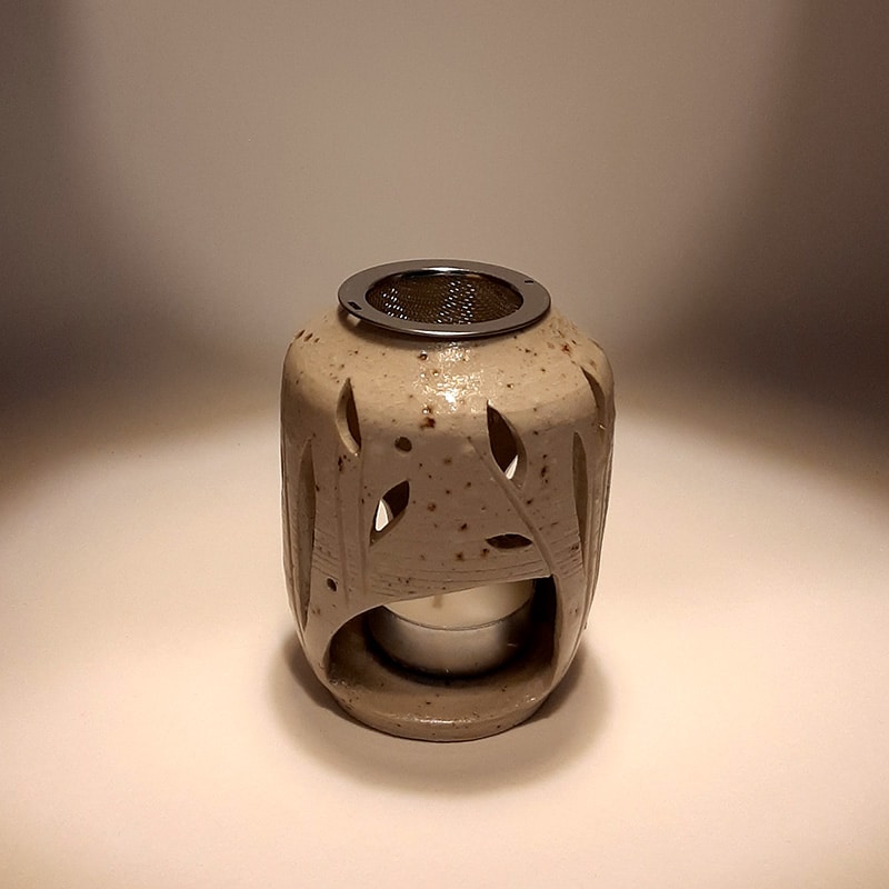 En grès clair chamotté, émail transparent, motif de flamme et partiellement troué, pour toutes les pièces de la maison, mais aussi dans un bureau pour assainir son coin de travail.