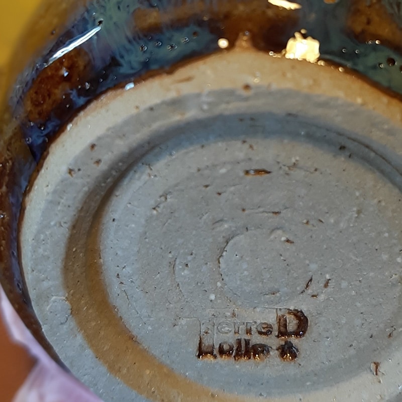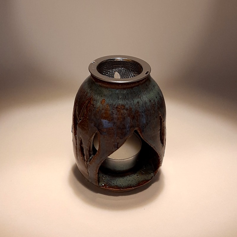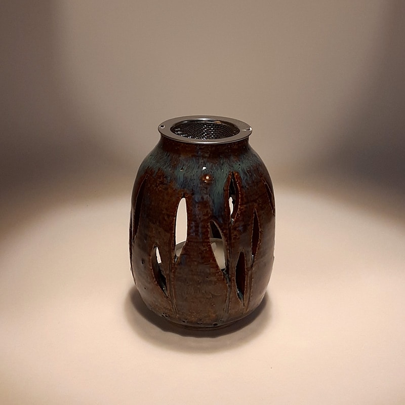 En grès clair chamotté, émail marron/bleu, motif de flamme et partiellement troué, pour toutes les pièces de la maison, mais aussi dans un bureau pour assainir son coin de travail.