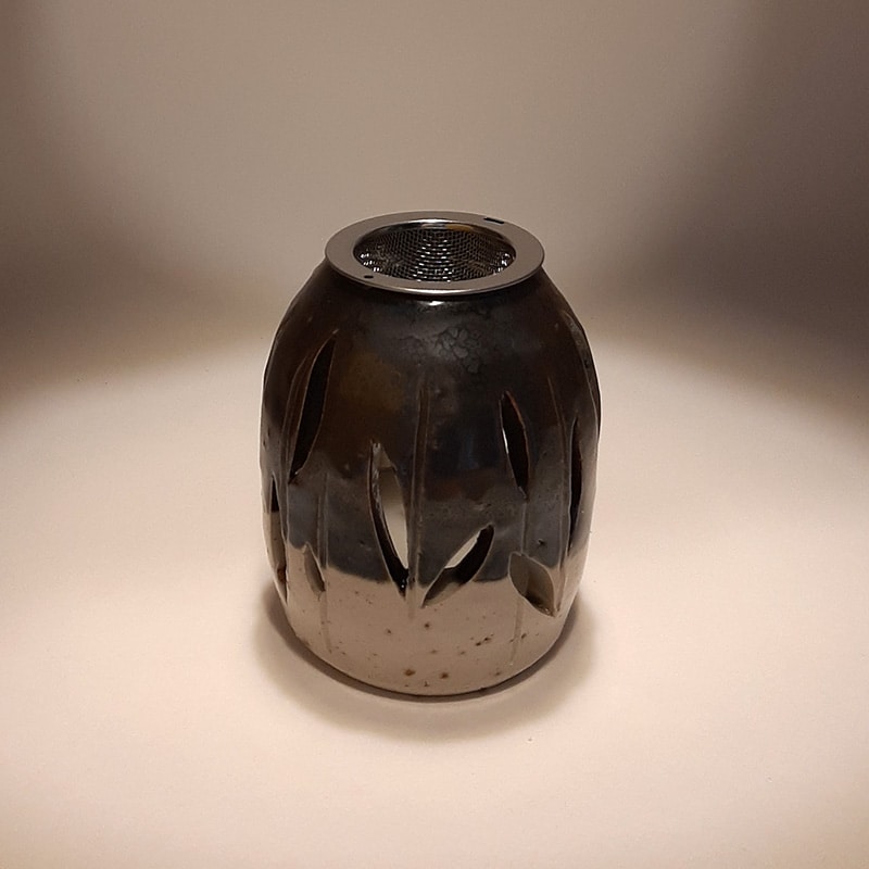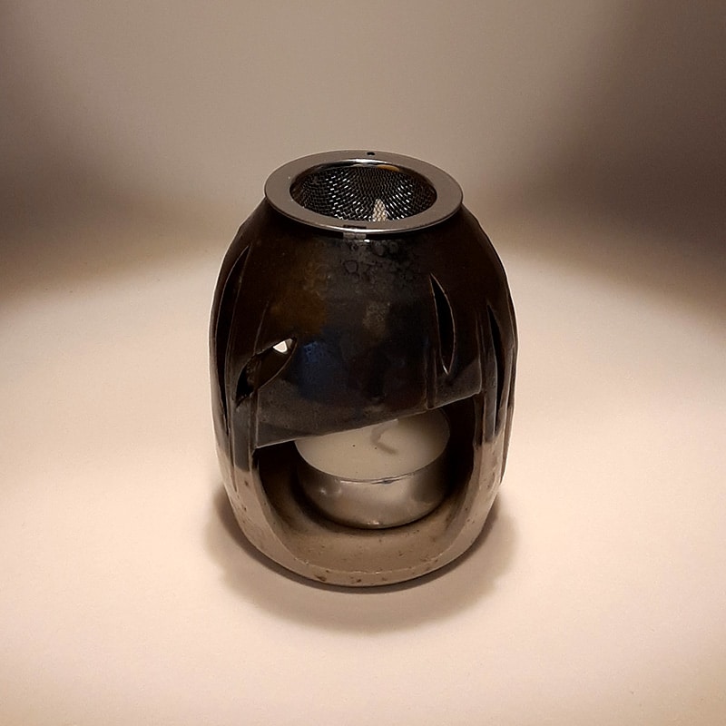 En grès clair chamotté, émail ivoire et noir, motif de flamme et partiellement troué, pour toutes les pièces de la maison, mais aussi dans un bureau pour assainir son coin de travail.
