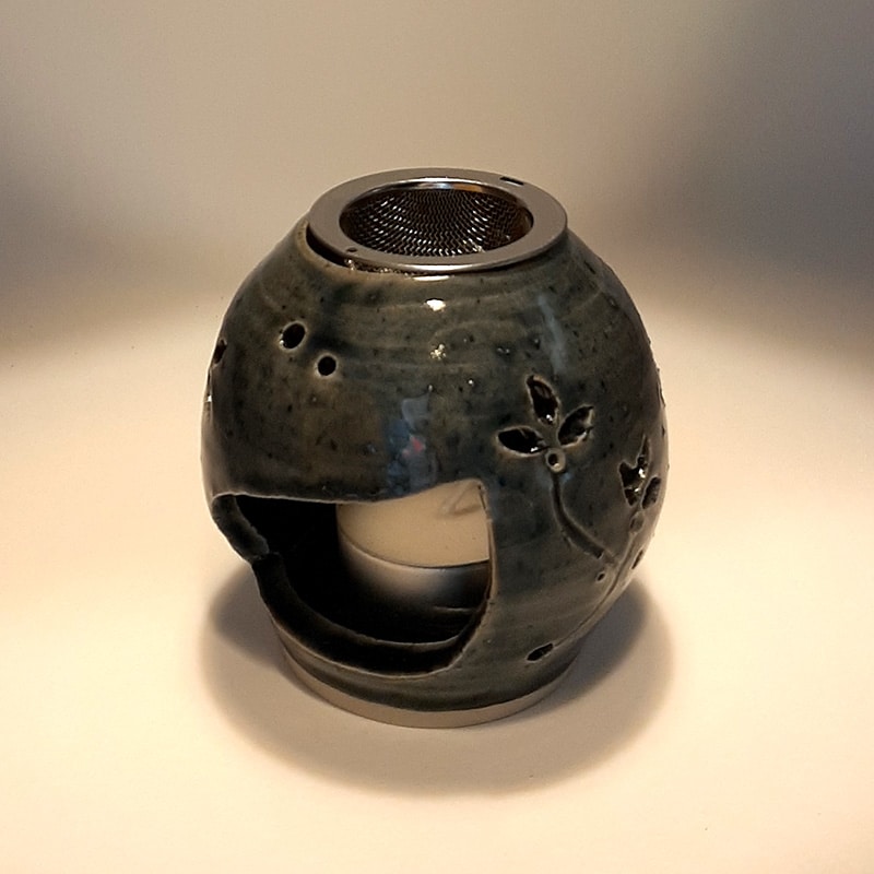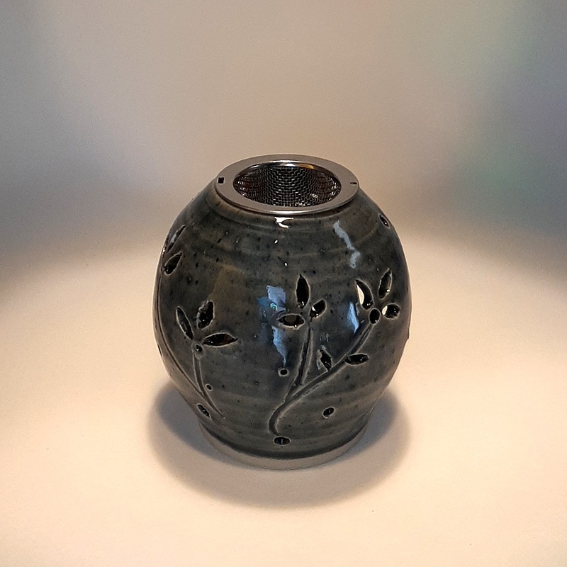 En grès clair chamotté, émail naturel ton bleu, il est troué de fleurs, pour toutes les pièces de la maison, mais aussi dans un bureau pour assainir son coin de travail.