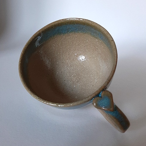 Petit déjeuner amoureux. En grès clair, émaillé de transparent, cette tasse est bordée d’un liseré couleur terre accompagné d’un bandeau dans les tons bleus céleste. Sa hanse vous offre un joli cœur à sa base.