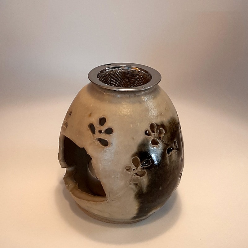 En grès clair chamotté, émail ivoire et noir, motif de fleur et partiellement troué, pour toutes les pièces de la maison, mais aussi dans un bureau pour assainir son coin de travail.