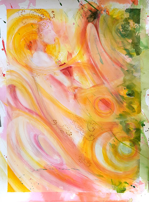 Travail sur la couleur, possibilité de paysage, mais non… Insatisfaction recouvrant d’un voile blanc en mouvement. Puis apparaît une nymphe sur son cygne.